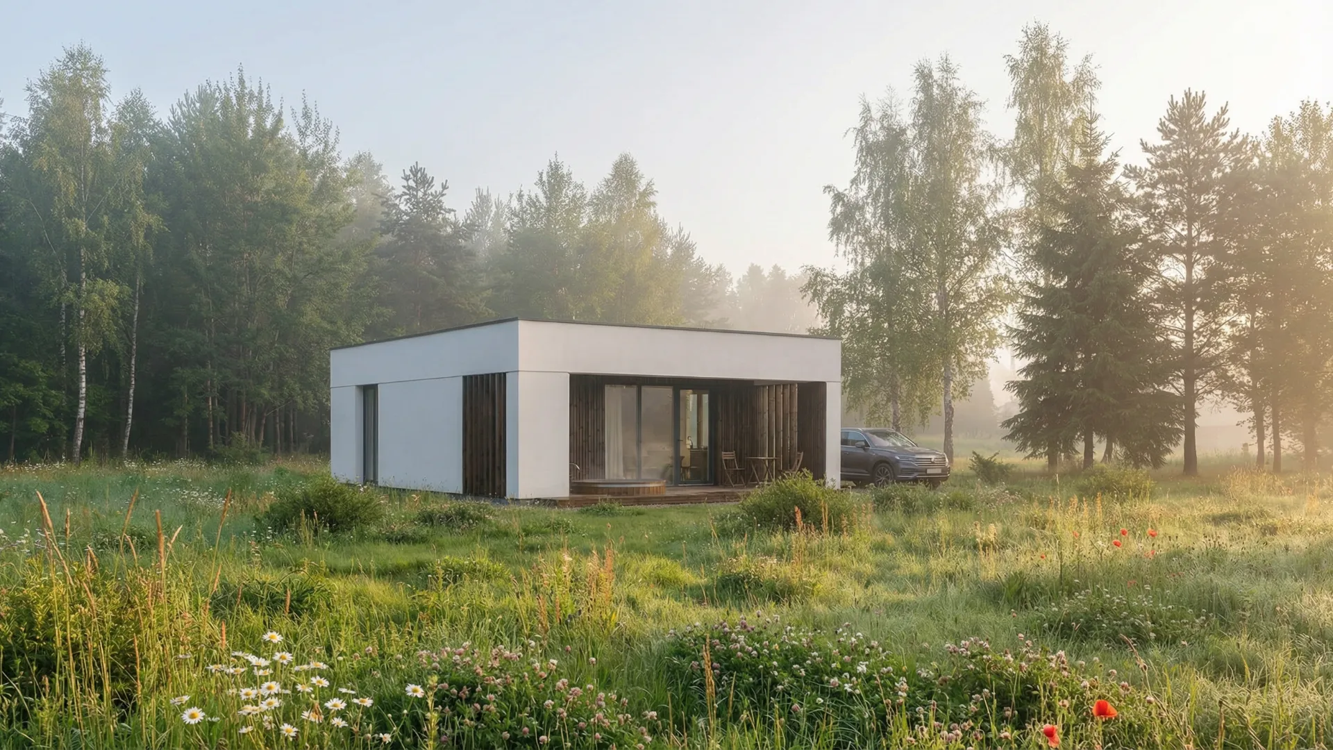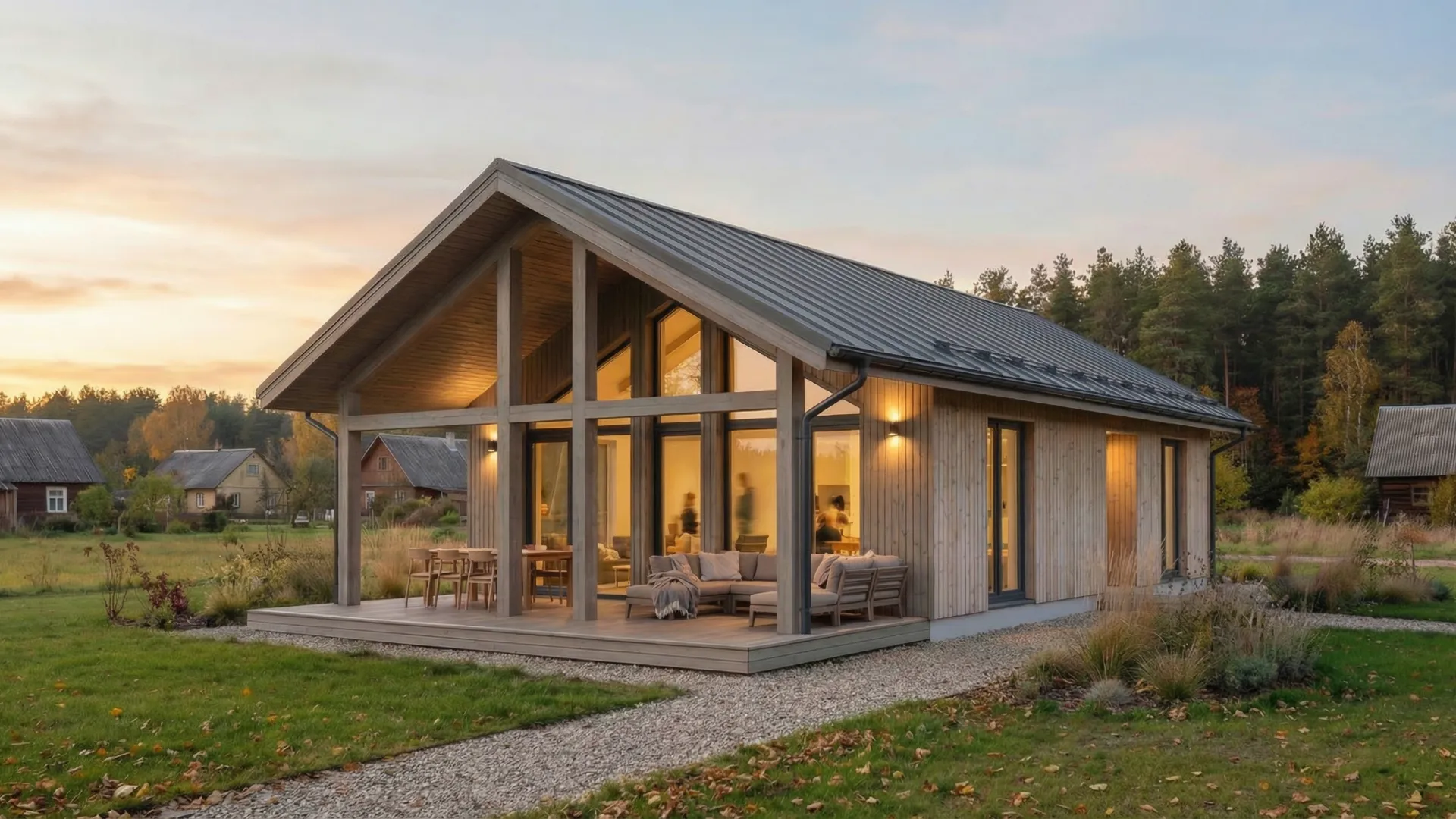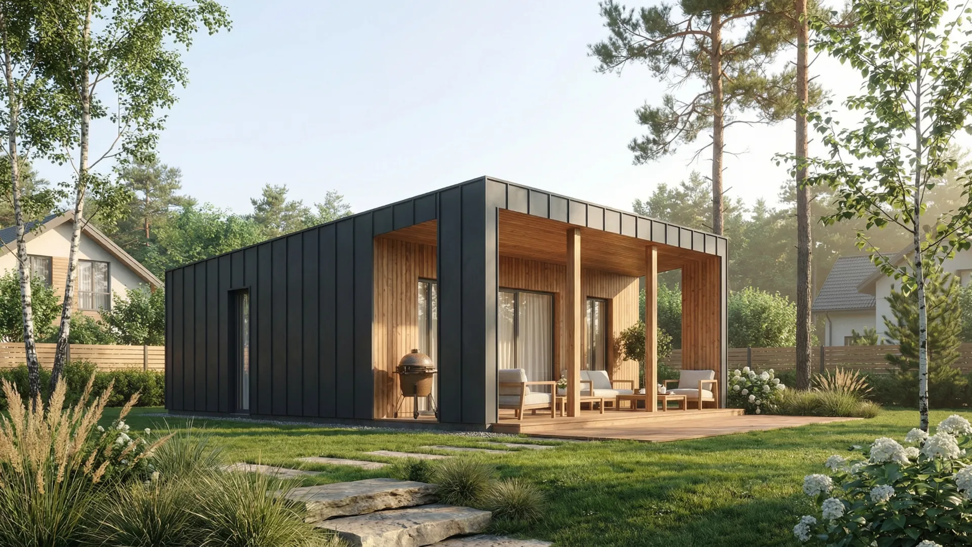 Tai reiškia mažiau dokumentų, trumpesnį procesą ir mažesnes išlaidas. 50 m² — tai ne mikroskopinis namelis: čia telpa svetainė su virtuve, du miegamieji ir vonios kambarys. Pakanka sodui, poilsiui ar kompaktiškam gyvenimui.