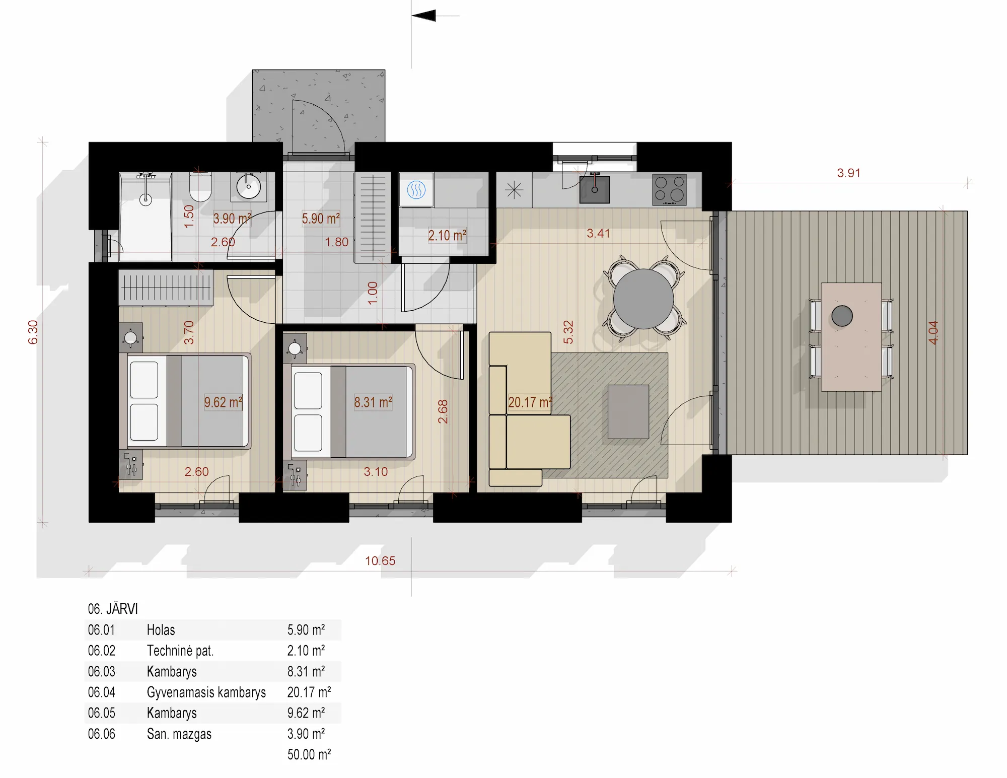 JÄRVI — kompaktiškas dvišlaičio stogo namas, sukurtas siauriems ir gamtiškiems sklypams. 50 m² suplanuoti efektyviai: svetainė su virtuve (20,17 m²), du miegamieji (9,62 ir 8,31 m²), erdvus prieškambaris (5,90 m²) su atskiru techniniu kambariu ir vonios kambarys. Namo plotis — tik 6,30 m, todėl jis puikiai tinka pailgiems sklypams arba miško juostai.