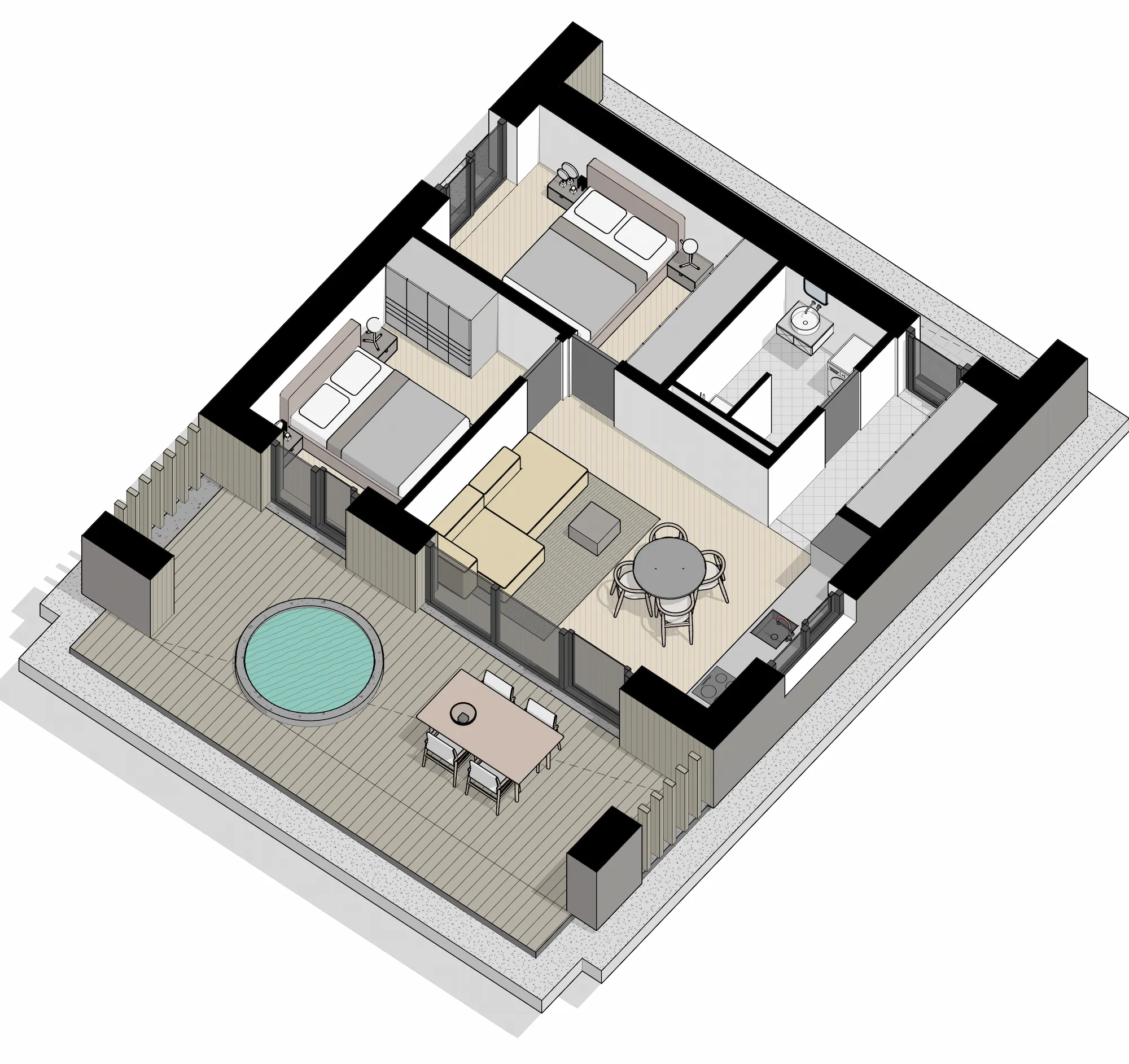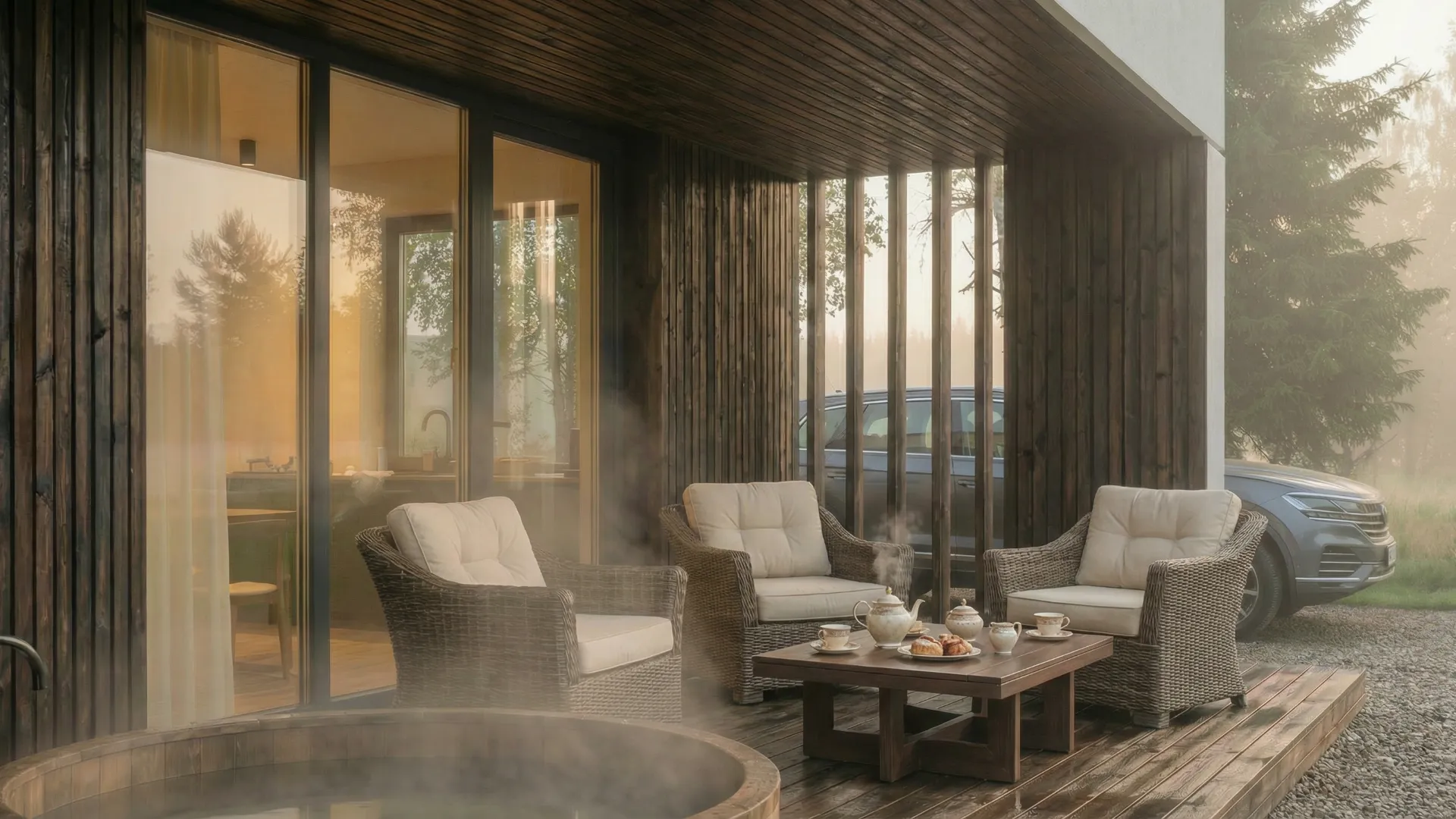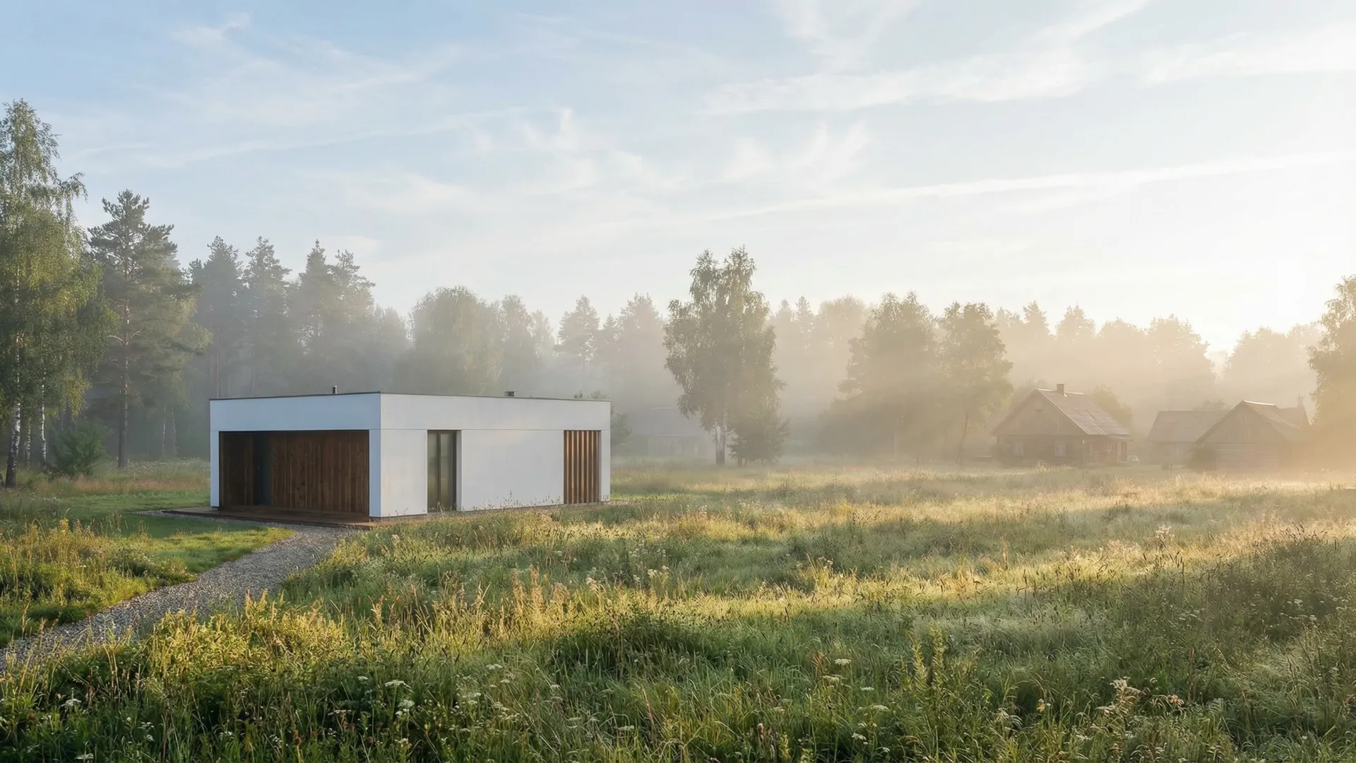Fasade — baltas tūris su vertikalių tamsinto medžio lamelių ekranais, kurie suteikia privatumą ir ritmą. 21 m² terasa su mediniu decku skirta poilsiui — čia vietos ir lauko baldams, ir karšto vandens kubilui. Plokščias stogas (3,71 m aukščio) leidžia namui likti žemu ir ramiu — idealiai tinka miško ar pievos pakraščio sklypui.